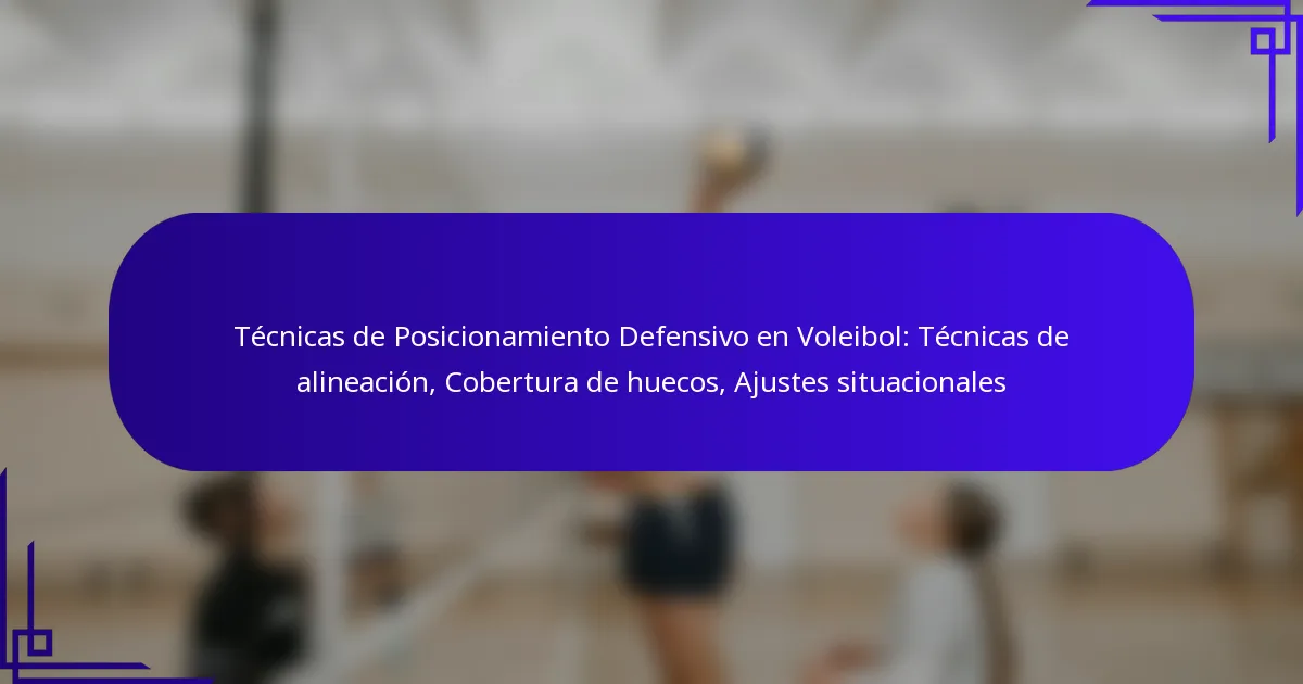 Las técnicas clave de alineación en el posicionamiento defensivo en voleibol implican formaciones estratégicas de jugadores, espaciado y ajustes basados en el ataque del oponente. Una alineación efectiva mejora la cobertura y minimiza los huecos, permitiendo a los equipos responder rápidamente a las jugadas ofensivas.